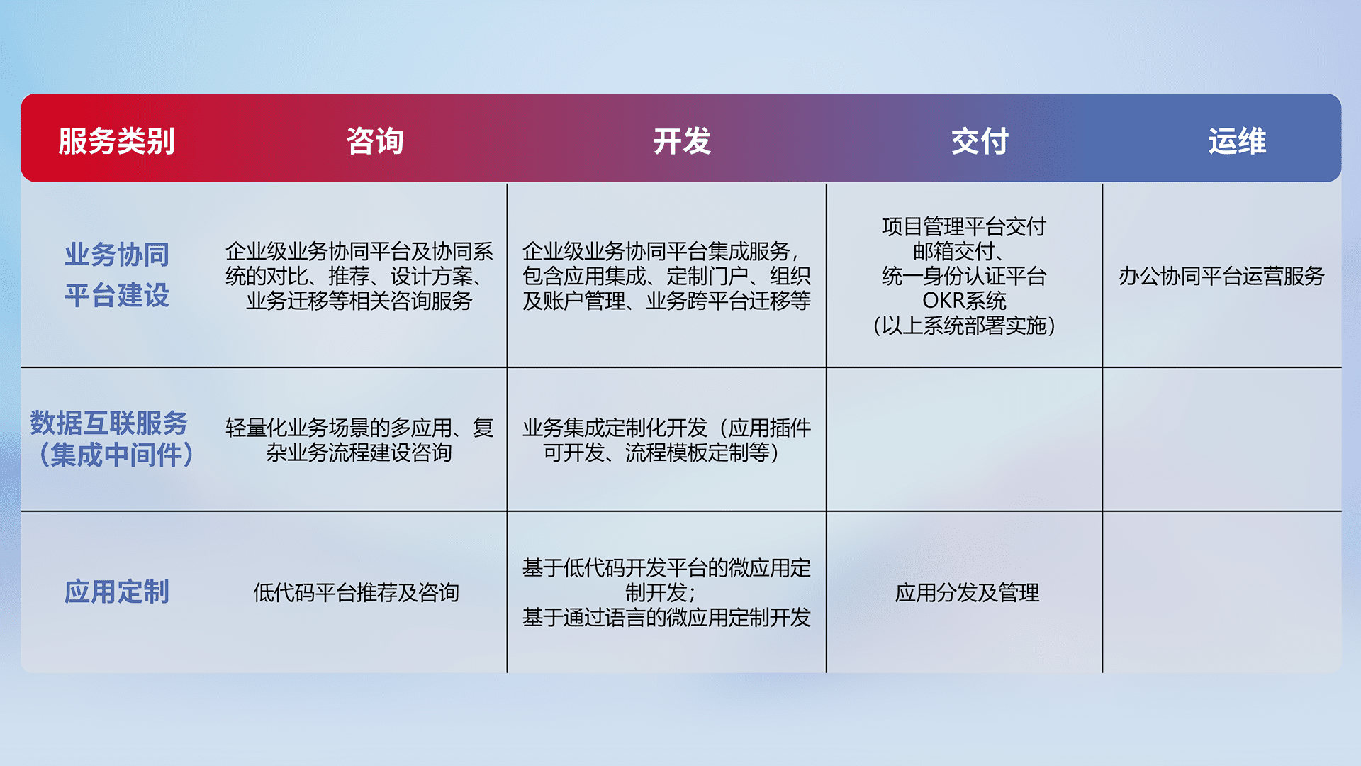 针对钉钉、、、企微、、、、IDaas等平台级产品提供产品的规划、、、方案、、、、交付、、、定制化开发等服务,,实现如统一协同办公、、、智能客户服务、、混合会议管理、、智能数据查询、、、等业务场景,,实现数字化转型。。。。